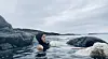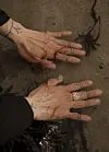 Paarnaq kigger på sine hænder, som bølgerne har dækket